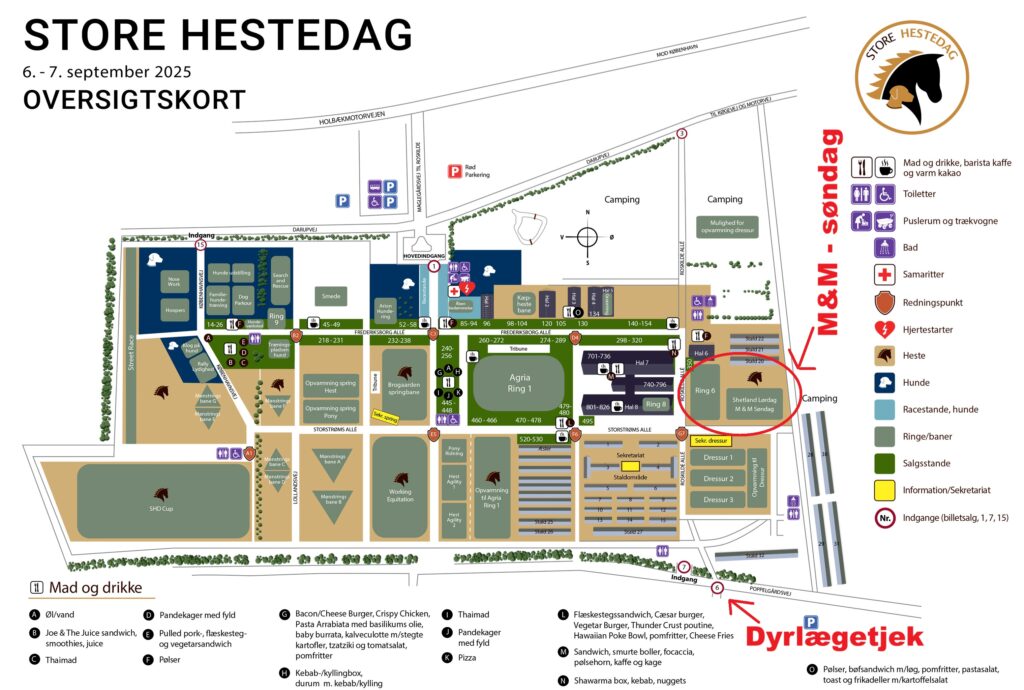 Der er dyrlægetjek ved port 6 (Poppelgårdsvej) fredag fra kl. 13.30 – 20.00 samt lørdag og søndag fra kl. 7.00 – 17.00 for showheste. Der er ikke krav om at showheste skal blive på pladsen til efter kl. 17.00.